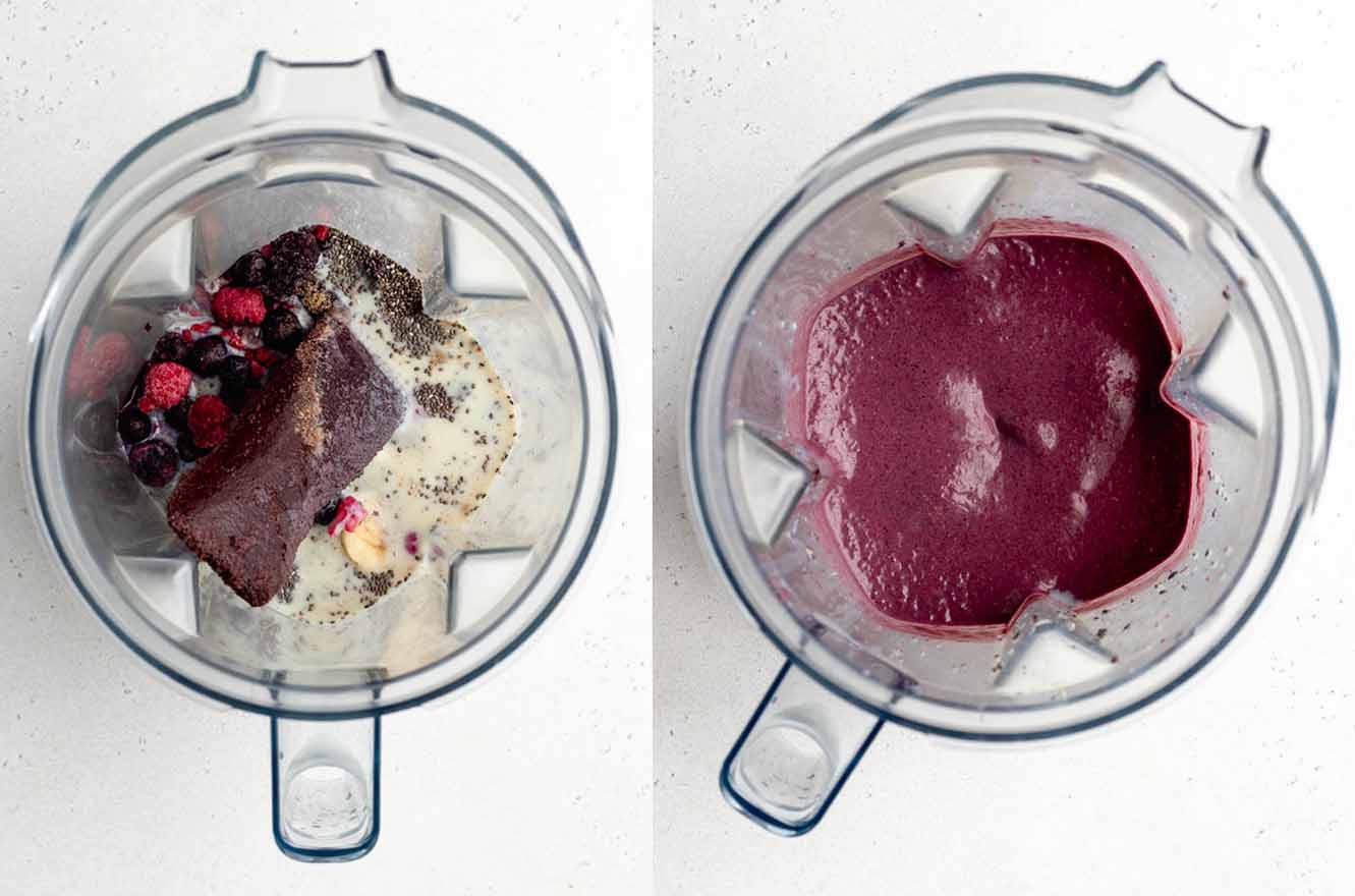 2. Add the Açaí pack to your blender along with the banana, frozen berries, soy milk, chia seeds, and ground flax.